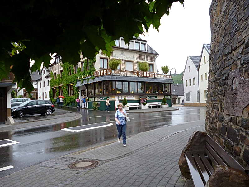 so ging es dann wieder in Richtung Ahrtal, die Landschaft war wunderschön. Der Regen hatte uns auch wieder eingeholt, über Adenau am Nürburgring bis zu dem kleinen Ort „Schuld“, dort wurden wir nett in einem gemütlichen Lokal empfangen und es gab ein Reibekuchen Büfett. Wir waren alle überrascht und kannten diese Art noch nicht. Alle Salatsorten gab es und waren frisch angemacht. Die Reibekuchen gab es am laufenden Band neu dazu. Es war ein vorzügliches Essen, so konnte jeder soviel und sooft er konnte und wollte seinen Teller füllen.