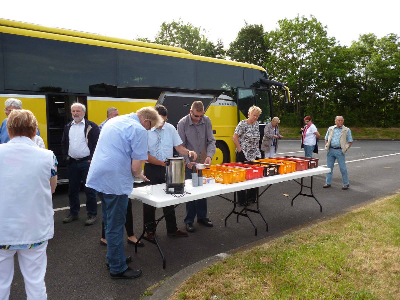 Als wir dann nach Verzögerung um 8:10 Uhr abfuhren, begann es zu regnen. Zum Glück hielt es nicht lange an, so konnten wir nach 1 1/2 Stdn dann auf einem Rastplatz auf der Autobahn Halt machen und frühstücken. Es gab frische Brötchen und heissen Kaffee dazu.