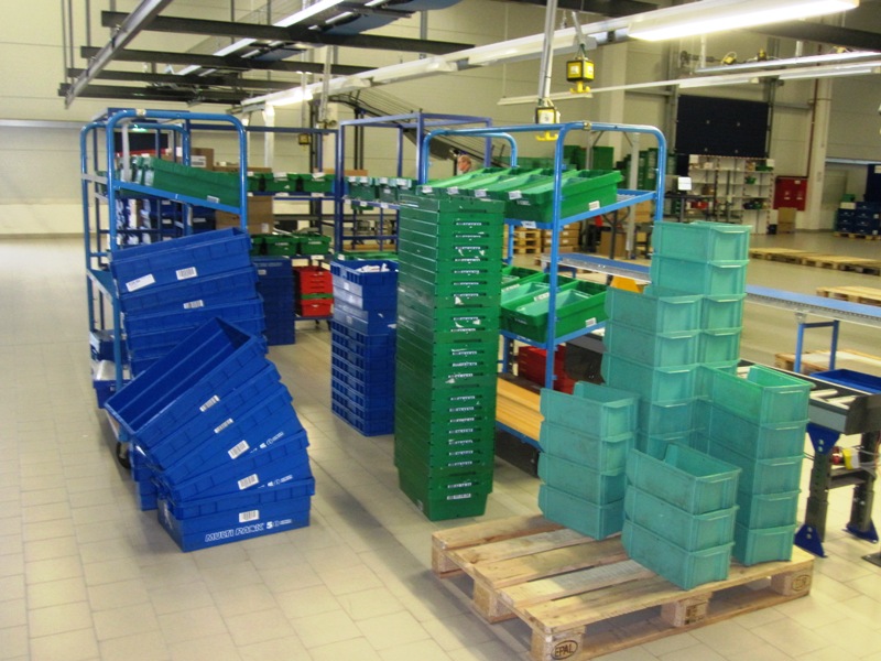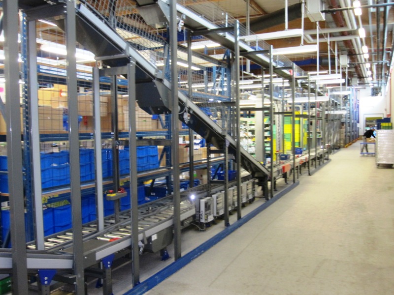 Bei der Besichtigung des Betriebes fällt auf, dass ein Großteil der Waren vollautomaltisch über die Förderweg läuft. Für die 1.200 Artikel, die die meiste Nachfrage haben, werden dies sogar vollautomatischen in die Behälter gefüllt. Es war faszinierend zu sehen, wie die Behälter auf den Förderwegen automatisch per Strichcodeabfrage ihren Weg zu den Regalen und anschließend zu den Verladestationen für die LKW´s gefunden haben.