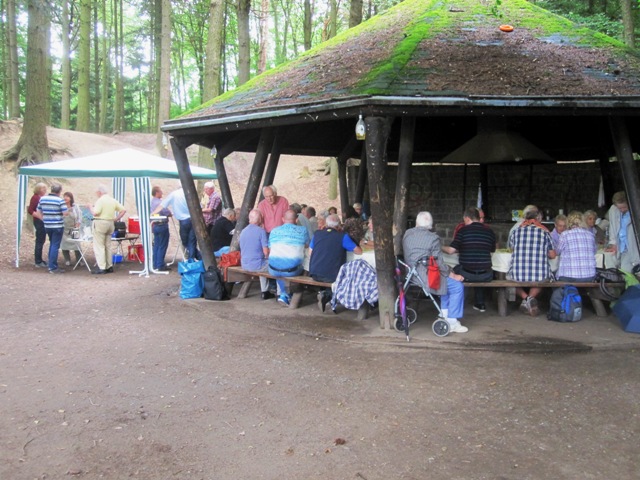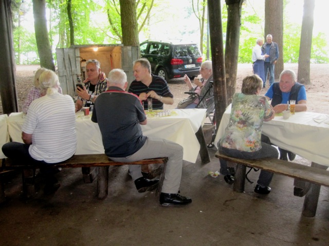 Wie üblich machten sich die Teilnehmer auf verschiede Weise auf den Weg nach Bensberg. Manche wanderten bei bedecktem Wetter von der Haltestelle Thielenbruch aus zur Saaler Mühle und einige kamen per Straßenbahn oder Auto direkt zur Grillhütte. Die Grillkohle war bereits angezündet und die ersten Würstchen und Fleischstücke brutzelten schon auf dem Grillrost. Auch der Kartoffelsalat und die übrigen Beilagen standen bereit und fanden regen Zuspruch. Für Getränke wie Bier, Wasser und Kaffee war ausreichend gesorgt. Zum Glück hatten wir einen Pavillon für die Getränke aufgestellt, da es zwischendurch etwas regnete. Nach dem Essen und den angeregten Unterhaltungen schaute mancher verdutzt auf die Uhr, wie schnell die Zeit vergangen war. Aber alle waren sich einig, dass die Teilnahme sich gelohnt hatte. Die Organisatoren wurden vielfach für den schönen Tag gelobt.