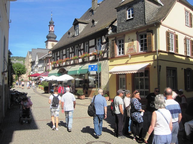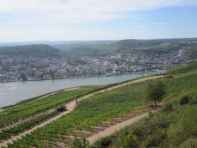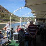 Da der Bus das Niederwalddenkmal nicht direkt anfahren konnte, ging es weiter nach Rüdesheim. Dort fuhren die Teilnehmer dann mit der Seilbahn auf den Berg. Nach der Besichtigung des Denkmals und einem Stadtbummel (u.a. durch die Drosselgasse) wartet um 14 Uhr das Schiff, die MS „Asbach“ am Anleger auf uns. An Bord gab es das Mittagessen. Bei schönem Wetter konnte man die Fahrt auf dem Rhein an Deck genießen. Die vielen Burgen und die Loreley waren schon sehenswert.
