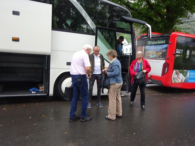 Unsere Herbstfahrt führte uns diesmal nach Cochem an die Mosel. Lag es am frühen Treffpunkt 7:30 Uhr am Colonius, am Zielort oder am Wetter. Man weiß es nicht. Jedenfalls hatten sich lediglich 33 Teilnehmer für die Fahrt angemeldet. Als die Plätze eingenommen waren und der Bus losfuhr, begann es zu regnen. Die geplante Kaffeepause unterwegs fand deshalb im Bus statt. Für belegte Brötchen war gesorgt. Der Busfahrer hatte allerdings Probleme mit der Kaffeemaschine. Zum Glück gab es welchen in der Raststätte.