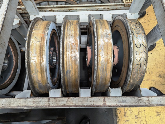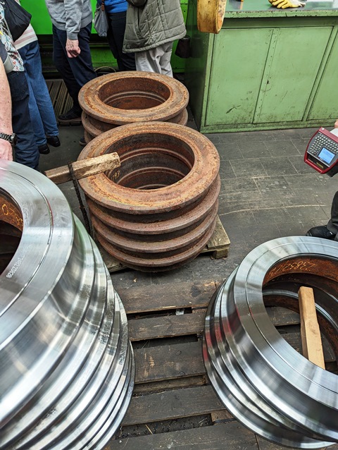 In den Hochregalen werden die Ersatzteile für Straßenbahnen gelagert. Räder werden als Rohlinge geliefert und von den Mitarbeitern auf großen Drehbänken auf das richtige Maß gedreht und danach auf die Achse gepresst.